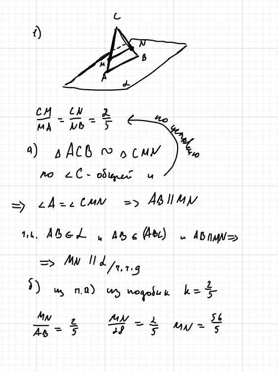 1) Вершина C треугольника ABC не лежит в плоскости α, а сторона AB лежит в этой плоскости. На сторонах AC и BC отметили точки M и N соответственно, причём CM : MA = CN : NB = 2 : 5.