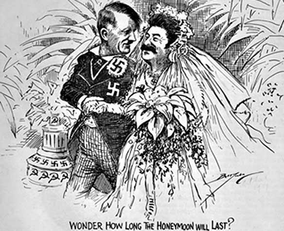 2) Эта карикатура показывает нам взгляд западных стран на взаимоотношения лидеров СССР и Третьего Рейха. Западные страны до не которой поры времени, были уверены в том, что Сталин и Гитлер близкие союзники. У них сложилось такое мнение, из - за деления территорий Польши и подписания пакта Молотова - Риббентропа. Когда Рейх, а позже СССР начали вводить свои войска в Польшу и подписали пакт о ненападении, была сделана эта карикатура
