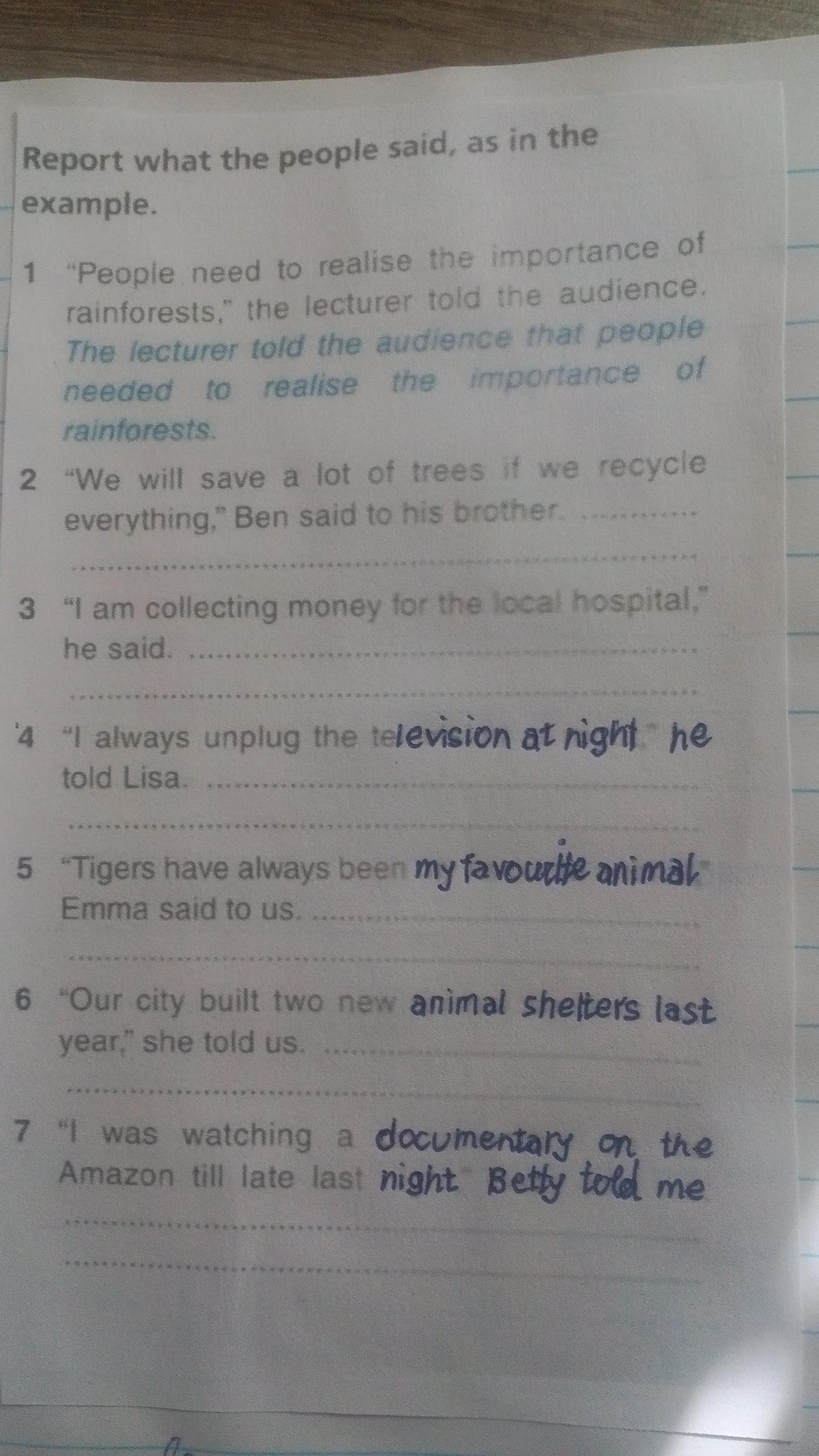 7. Betty told me that she had been watching a documentary on the Amazon till late the night before.