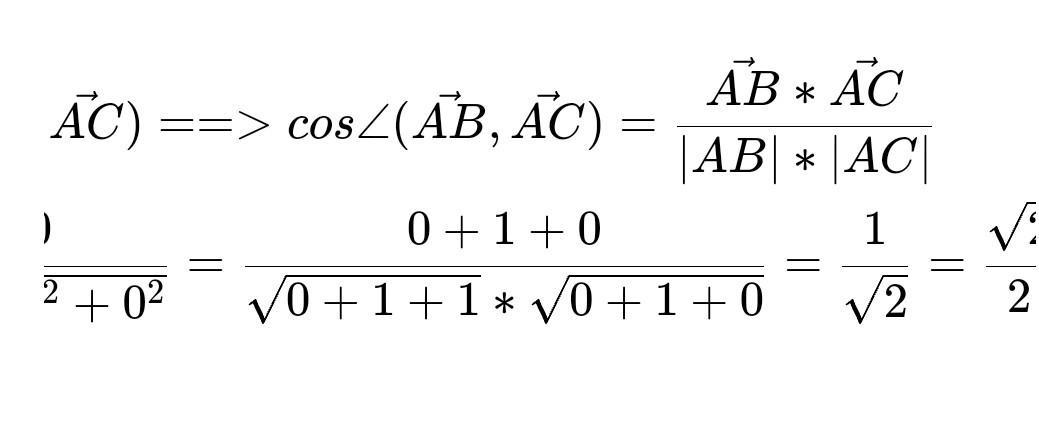 Величину < BAC обчислимо із скалярного добутку щойно знайдених векторів , між якими й розміщений цей кут . Скалярний добуток двох векторів дорівнює сумі добутків їхніх відповідних координат . Модуль вектора a ( x , y , z ) можна знайти за формулою