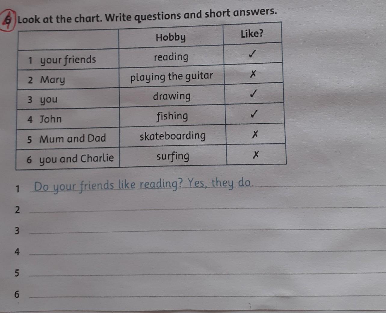 Все вопросы задаются по одной схеме: вспомогательный глагол для Present Simple (do/does) + подлежащее + like + хобби. В ответе используется такой же вспомогательный глагол, как и в вопросе.
