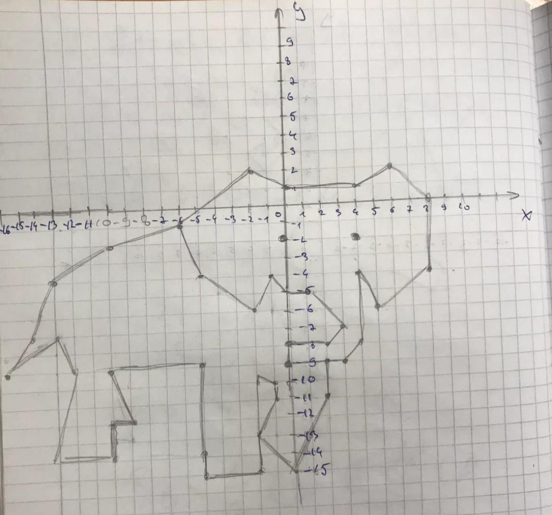 (- 6; - 1), (- 5; - 4), (- 2; - 6), (- 1; - 4), (0, - 5), (1; - 5), (3; - 7), (2; - 8), (0, - 8), (0, - 8) (0; -9), (3; -9), (4; -8), (4; -4), (5; - 6) (8; - 4), (8; 0), (6; 2) , (4; 1), (0; 1), (- 2; 2), (- 6; - 1), (- 10, - 2), (- 13; - 4), (- 14; - 7), (- 16; - 9), (- 13; - 7), (- 12; - 10) (- 15), (- 14), (- 10, - 14), (- 10, - 10), (- 10, - 13), (- 9, - 13), (- 10, - 9), (- 5), (- 5), (- 2; - 15), (- 2; - 15), (- 2; - 13), (- 2; - 10), (- 1; - 10) (- 1; - 11), (- 2; - 13), (0; - 15), (2; - 11), (2; - 9)(0; - 2)(4; - 2) нарисовать слона по координатам СРОЧНО ПОМОГИТЕ ПОЖАЛУЙСТА