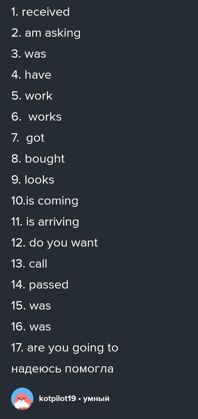 How are you. I (1) for the cake I (2) (be) very nice. I now (4) (receive) your letter last week. Thank you for the recipe (ask) for. I made it last week and it (3) (have) a new job in a supermarket in the city centre.I go there every day at 3 o'clock in the afternoon and (5) till 10 o'clock in the evening. I am very happy because my sister (6) there too so we travel to and from work together. 1 (7) (work) there (work) (get) my first wages (buy) a new stereo for my last week and I went shopping immediately! I (8) bedroom. It is gold and black and (9) (look) very nice. My brother (10) (come) to stay with me for a few days next week. He (11) (arrive) on Saturday so I am going to collect him from the station. After I collect him, we are going to that Mexican restaurant near the park. (12) (you/want?) to come with us? You can (13) told me that you (14) (call) me to tell me if you want to come or not. John (pass) your Spanish exam last month. Congratulations. (be) terrible at (you/go?) to visit Spain for your next (15) (be?) difficult? You know that I (16) languages but you are better. (17) holiday so you can practice it? Please write to me soon with all your news, Mary. помогите пожалуйста надо писать кратко
