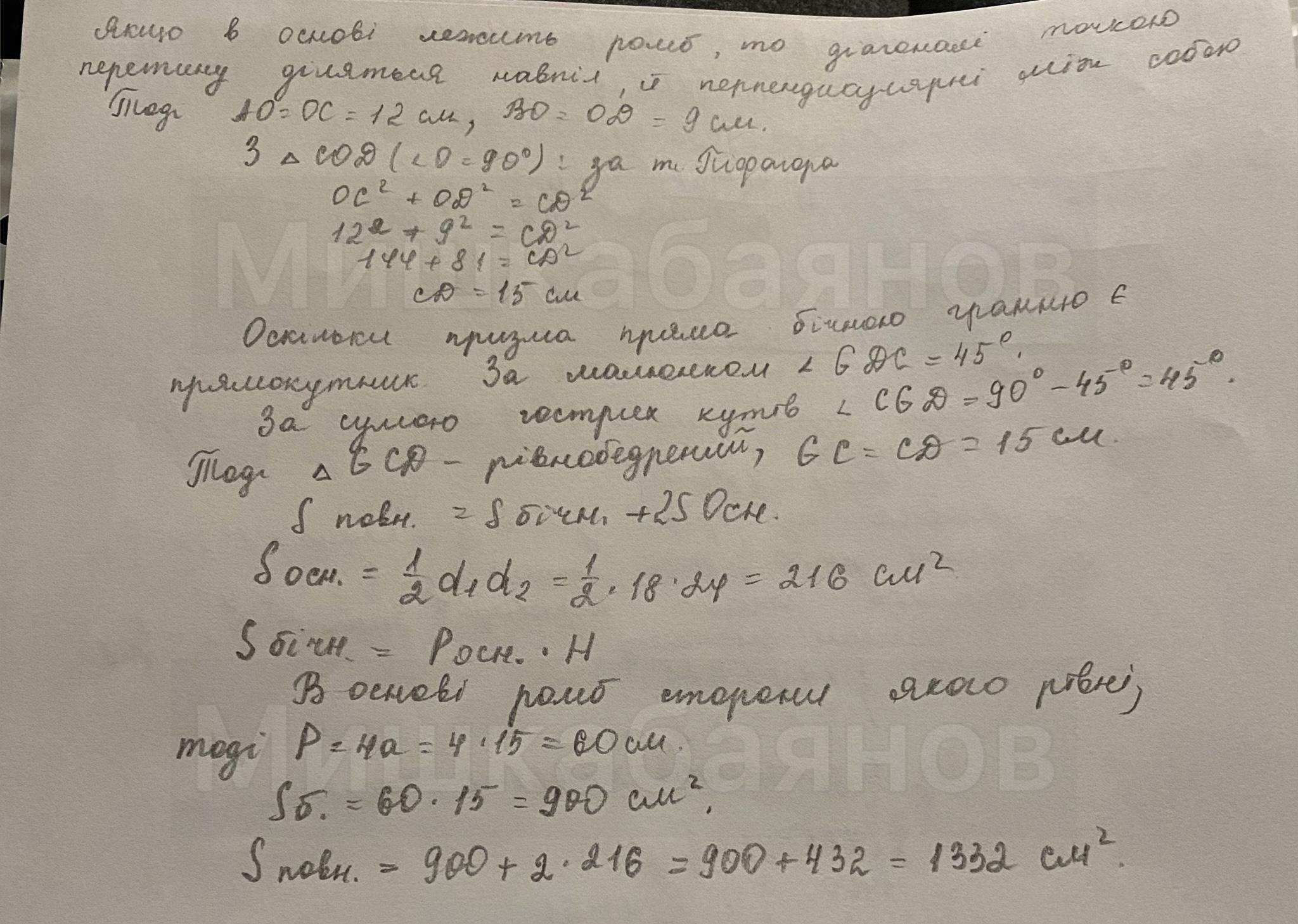 Дано: ABCDEFGH – прямая призма. ABCD – ромб. АС = 24, BD = 18.