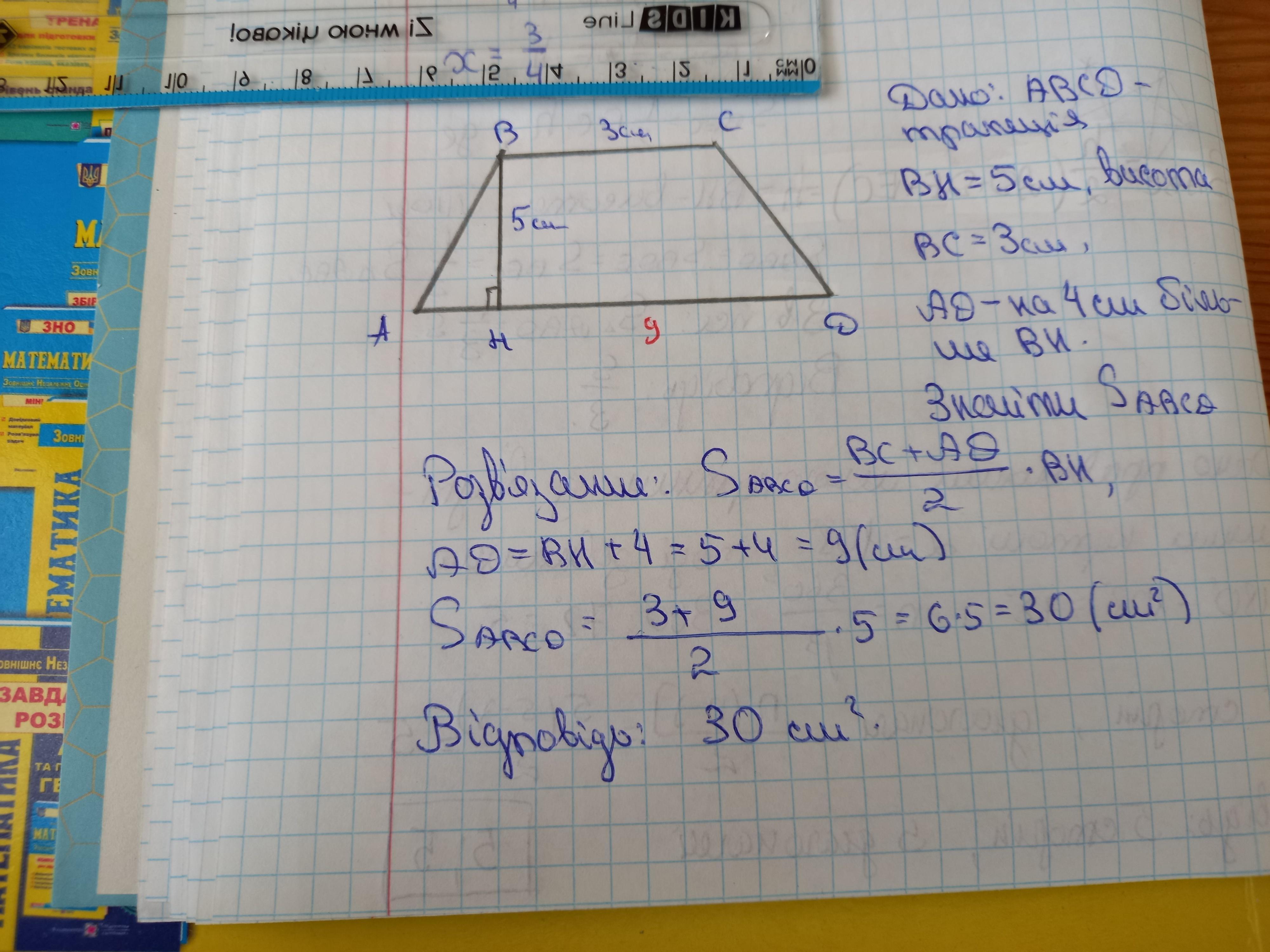 Обчислити площу трапеції, якщо її висота дорівнюе 5 см, одна основа 3 см, а iнша на 4 см більша від її висоти