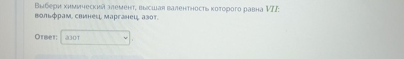 Выбери химический элемент, высшая валентность которого равна VII: вольфрам, свинец, марганец, азот. Ответ: