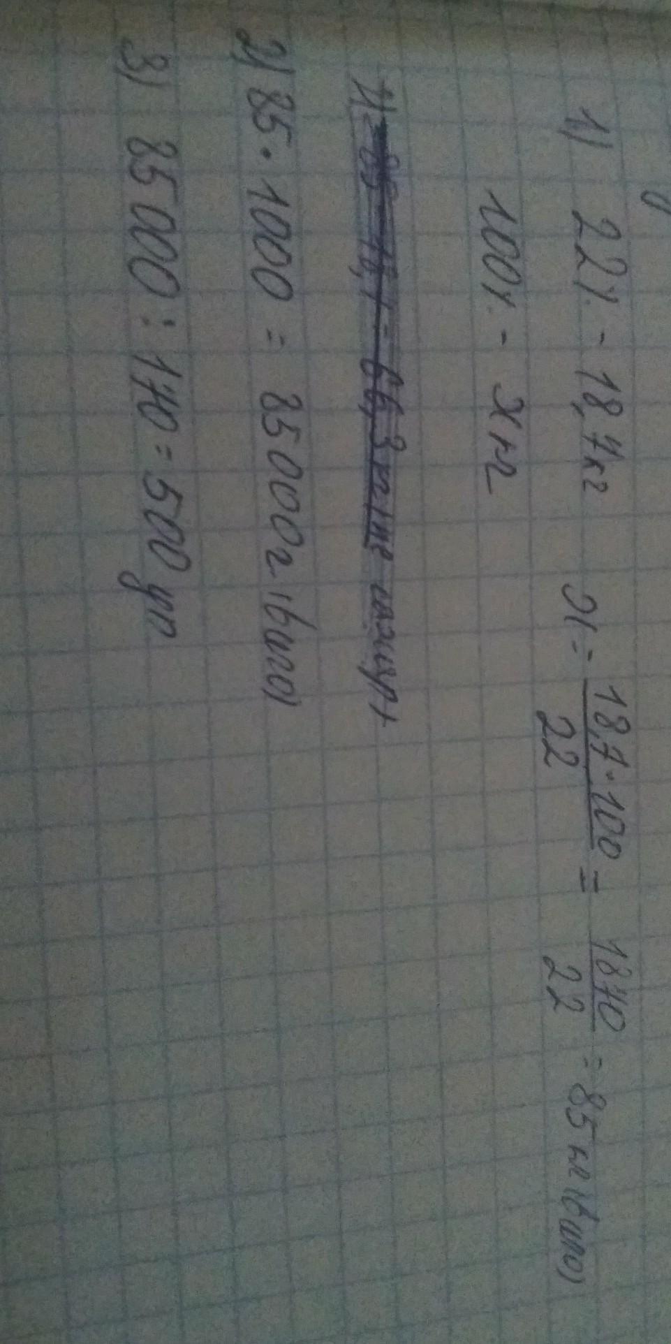 1) 18,7÷0,22=85(кг)-общий весь всех пачек
