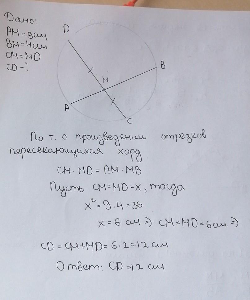В окружности две хорды АВ и СД , они пересекаются в точке М, АМ=9см ВМ=4см и СМ=МД .Найдите сколько СД