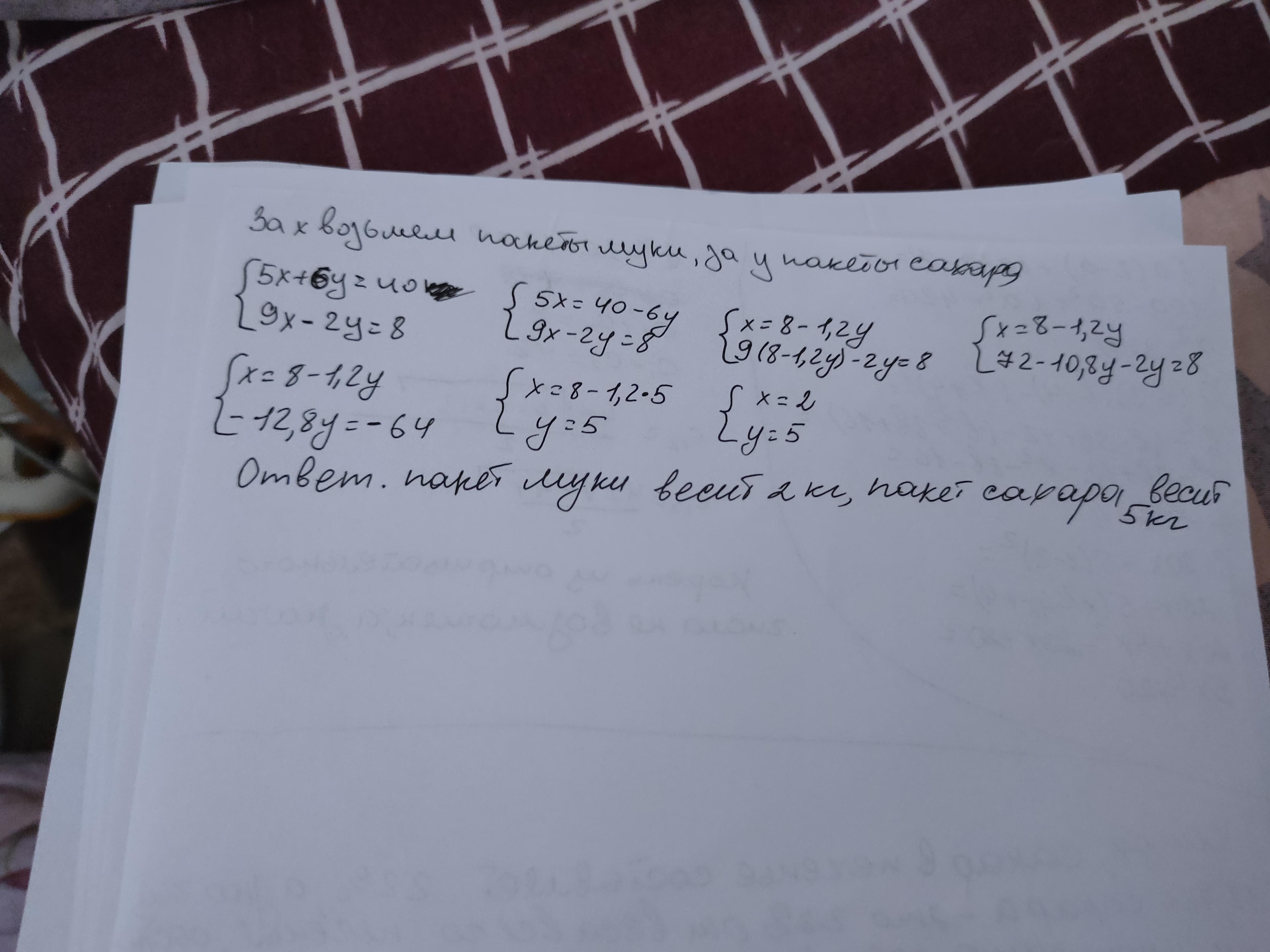 масса 5 пакетов муки и 6 пакетов сахара равна 40кг, какова масса пакета муки и пакета сахара, если масса 2 пакетов сахара на 8кг меньше 9 пакетов муки?