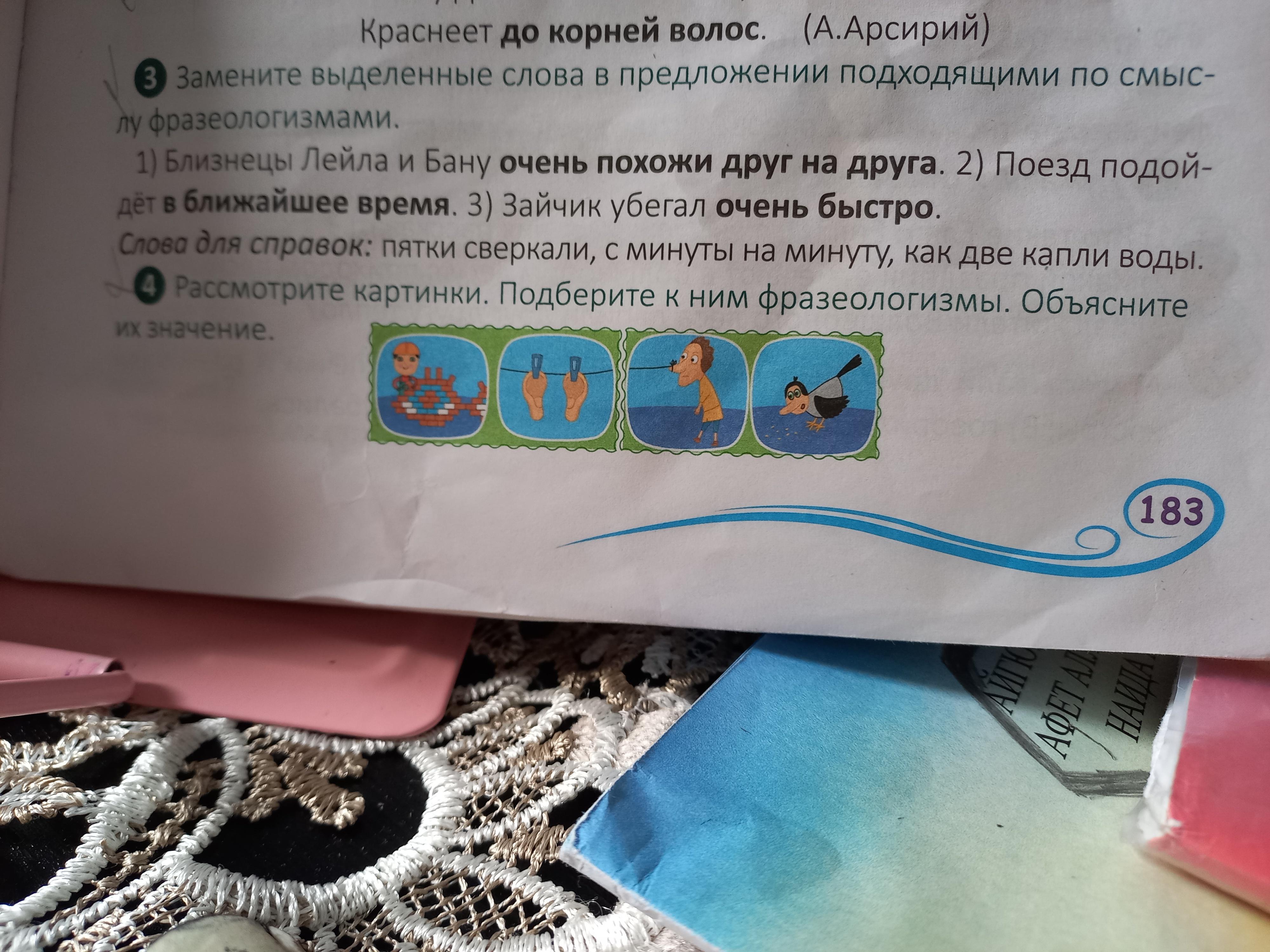 1.Близнецы Лейла и Бану как две капли воды.2.Поезд подойдет с минуты на минуту.3.Зайчик убегал так быстро что пятки сверкали