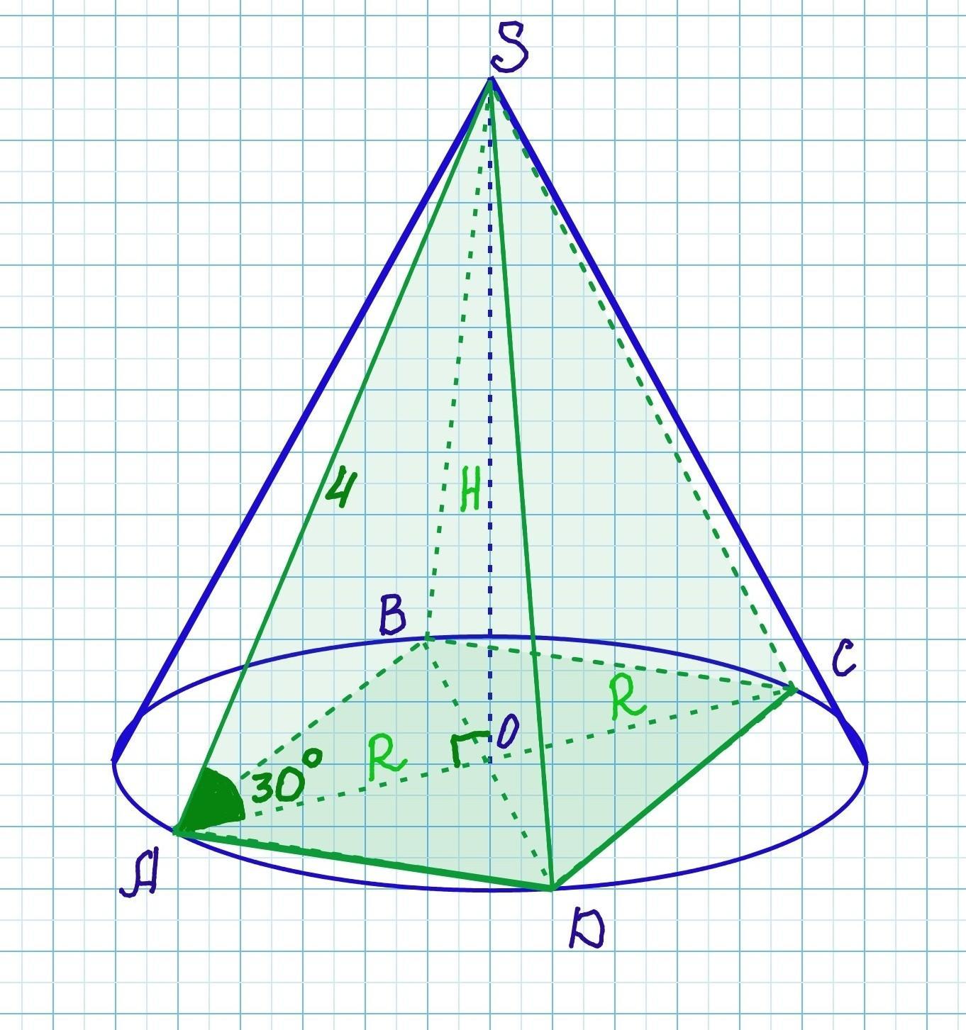 задан конус в который вписана правильная четырехугольная пирамида SABCD.Образующая конуса SA равна 4 и наклонена к плоскости основания под углом 30 градусов. Найдите объем конуса.