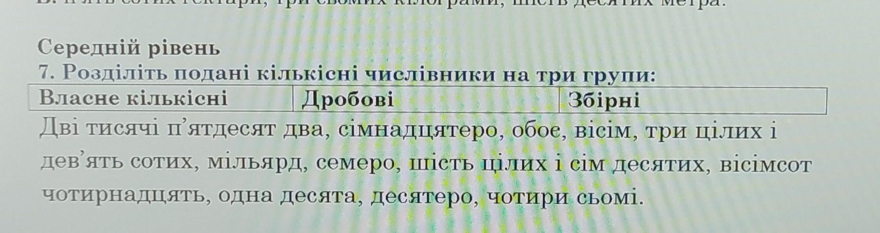 Дробові: три цілих і дев’ять сотих, шість цілих і сім десятих, одна десята, чотири сьомі