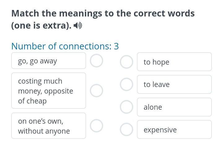 Match the meanings to the correct words (one is extra). ◄ Number of connections: 3 go, go away O to hope to leave costing much money, opposite of cheap on one's own, without anyone O O O alone O expensive