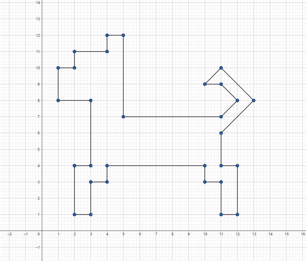 Необходимо нарисовать координатную плоскость, отметить начальную точку , и затем двигаться по точкам по порядку и рисовать линии. В конце получится вот такая двуногая собачка