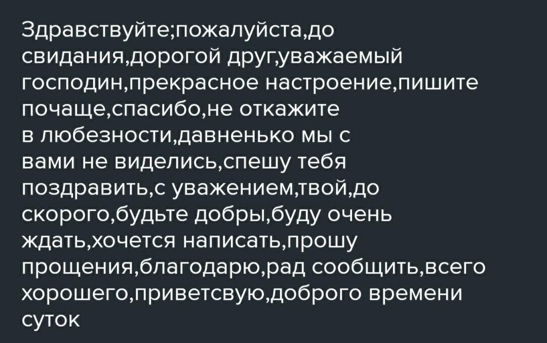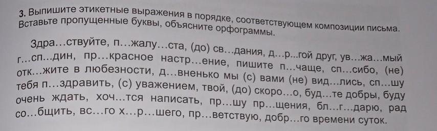 3. Выпишите этикетные выражения в порядке, соответствующем композиции письма. Вставьте пропущенные буквы, объясните орфограммы. Здра...ствуйте, п...жалу...ста, (до) св...дания, д......гой друг, ув...жа...мый г...сп...дин, пр...красное настр...ение, пишите п...чаще, сп...сибо, (не) отк...жите в любезности, д...вненько мы (с) вами (не) вид...лись, сп...шу тебя п...здравить, (с) уважением, твой, (до) скоро...о, буд... те добры, буду очень ждать, хоч...тся написать, пр...шу пр...щения, бл.......дарю, рад со...бщить, вс...го х...р...шего, пр...ветствую, добр...го времени суток.