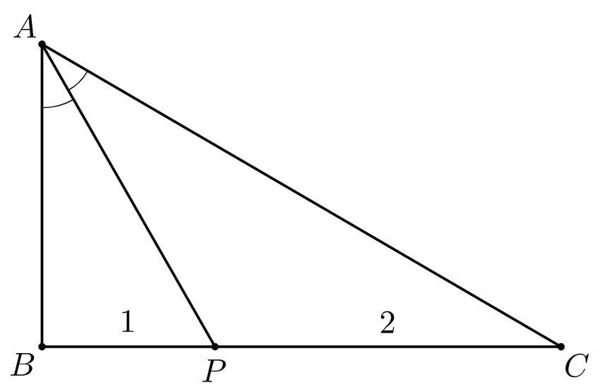В прямоугольном треугольнике с прямым углом B проведена биссектриса AP так, что BP = 1, PC = 2. Найти длину биссектрисы.