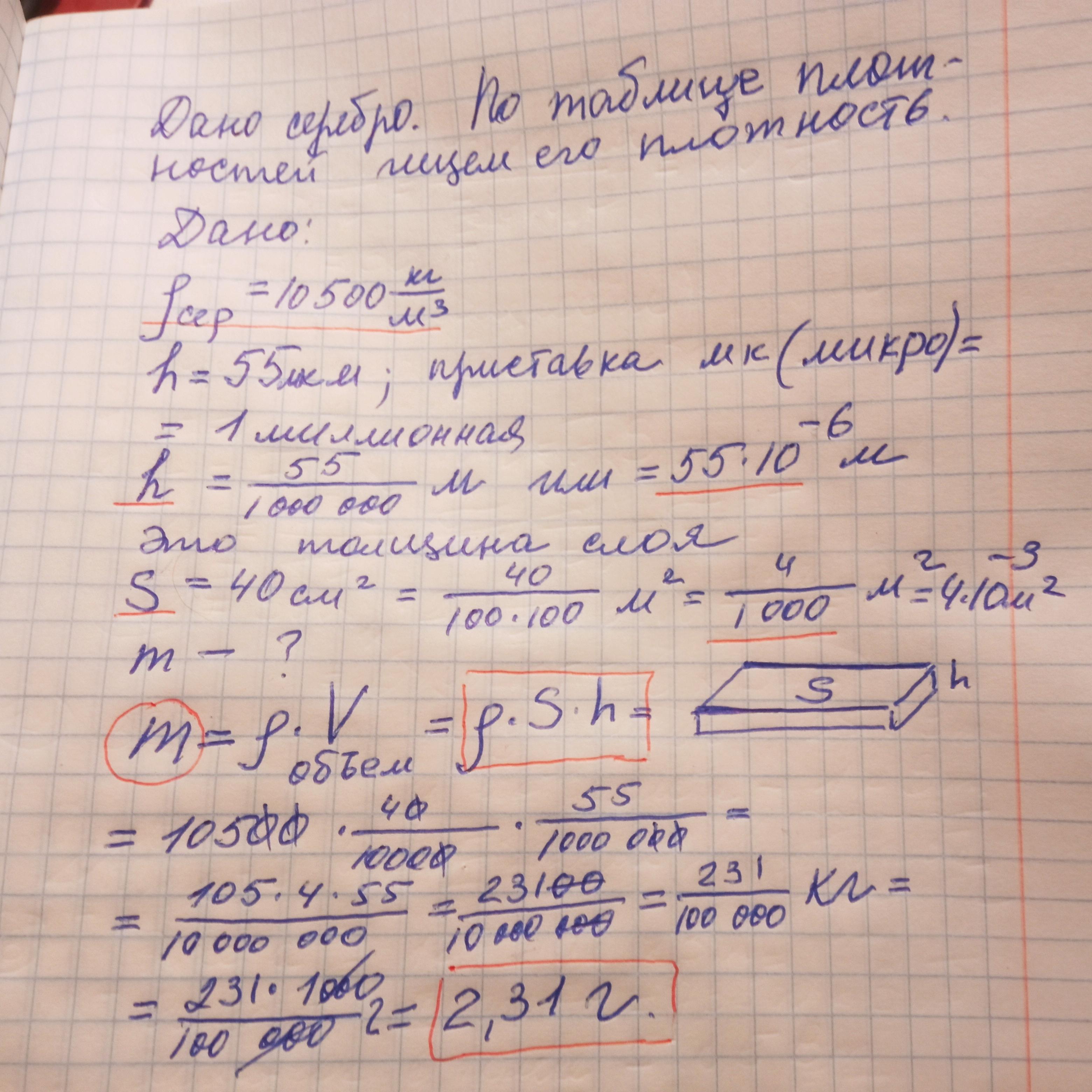 Во время серебрения стальной ложки на ее поверхность был нанесен тонкий слой серебра толщиной 55 мкм. Определите маму серебра, если площадь поверхности ложки равна 40 см2. (Дано, решение). Переводчик.