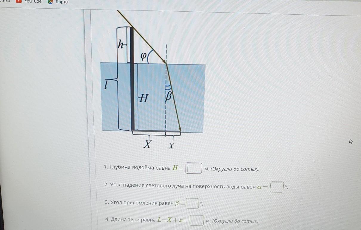 Реши поэтапно задачу. Железобетонная опора для моста находится в воде, причем высота возвышения опоры над поверхностью озера равна h=0,38 м, длина всей опоры — L= 1,89 м . Рассчитай длину тени на дне озера от опоры, если показатель преломления воды равен n- √1,5, угол между падающими на поверхность озера солнечными лучами и горизонтом - ф - 30°.