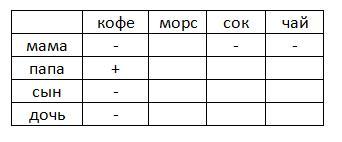 Тот кто пьёт кофе(не сын и не дочь)сидит между тем кто пьёт сок и мамой. Значит, кофе пьет не сын, не дочь и не мама. Значит, кофе пьет папа. Занесем результаты в таблицу.