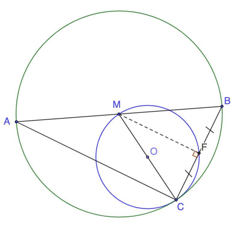 Задан треугольник ABC, AB = 8. Из вершины C проведена медиана CM. На медиане CM как на диаметре построена окружность, которая пересекает сторону BC в точке F так, что F – середина BC. Найдите радиус окружности, описанной около треугольника ABC.