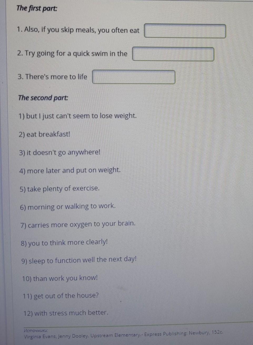 Условие задания: 125. Read the texts about health concerns. Dear Andrew, I'm really overweight! I've cut out breakfast and all fatty foods, but I just can't seem to lose weight. I'm desperate - please help! Hungry & Miserable, Coventry Don't despair! First of all, you should always eat breakfast! Imagine you're a car. If your fuel tank is empty, it doesn't go anywhere! Also, if you skip meals, you often eat more later and put on weight. You should eat a balanced diet and take plenty of exercise. That's the best way to lose weight! Dear Andrew, I sit at a desk all day. But I always seem to feel tired! Any suggestions? Sleepy, Cardiff Try going for a quick swim in the morning or walking to work. When you exercise, your heart beats faster and your blood carries more oxygen to your brain. This gives you more energy and helps you to think more clearly! Also, do you get enough sleep? Remember, most people need 7-8 hours of sleep to function well the next day! Dear Andrew, I'm always stressed out! I work long hours and find it hard to relax when I get home. What can I do? Stressed, Brighton Take it easy! There's more to life than work you know! Why not take up a new sport or hobby to get out of the house? You could join a gym! If you exercise regularly, your body copes with stress much better. Also, try not to drink too much coffee, and tea. If you drink a lot of caffeine, it increases anxiety. Match the parts of the sentences. Write the correct number of the part (1,2,3...): The first part: 1. Also, if you skip meals, you often eat 2. Try going for a quick swim in the