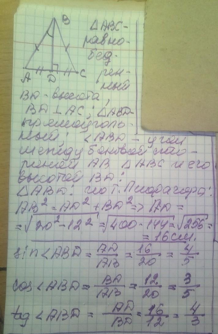 Бічна сторона рівнобедреного трикутника дорівнює 20 см, а висота проведена до основи - 12 см. Знайти синус, косинус і тангенс кута між бічною стороною та вказаною висотою.