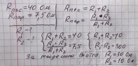 Два резистора спочатку з'єднали послідовно, а потім паралельно. Опори з'єднань виявилися 40 (Ом) i 7,5 (Ом). Визначте опори цих резисторів. дам 30балов