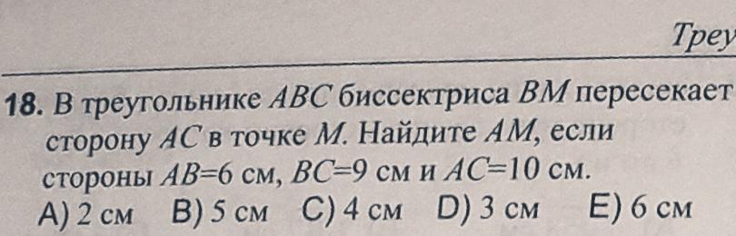 В треугольнике АВС биссектриса ВМ пересекает сторону АС в точке М. Найдите АМ, если стороны АВ=6см, ВС=9см и АС=10см