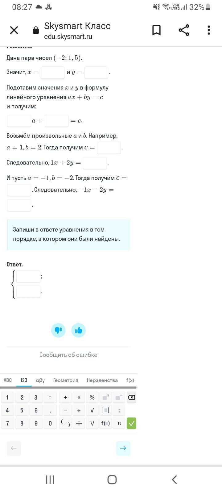 Дана пара чисел (-2; 1,5). значит, х=-2 и у=1.5. Подставим значения х и у в формулу линейного уравнения ах+by=с и получим: -2a+1,5b=c. Возьмём произвольные а и b. Например, a = 1, b = 2. Тогда получим с=1 следовательно, 1х+2у=1. И пусть а=-1, b=-2. Тогда получим с=-1. Следовательно, -1x-2у=-1.