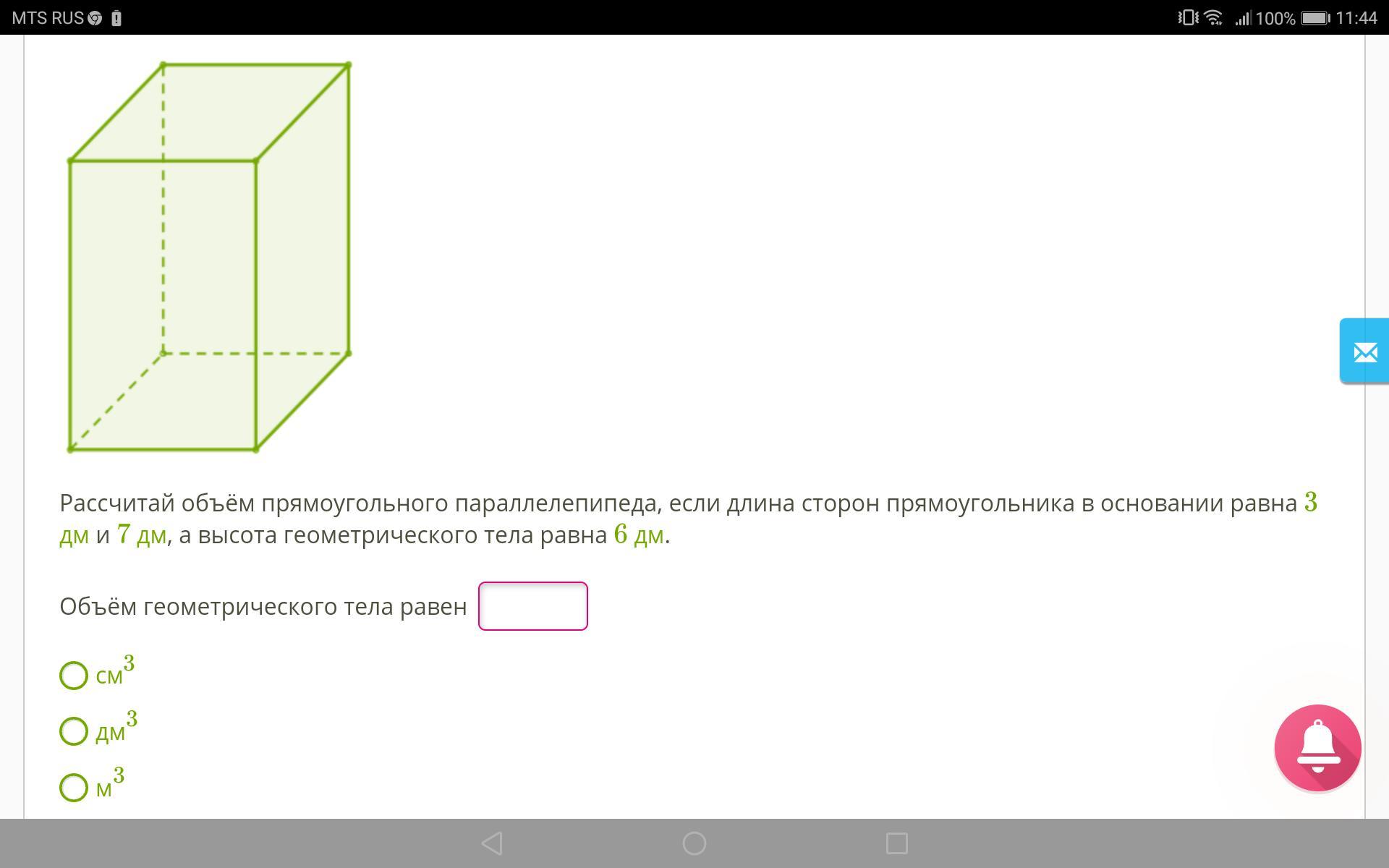 В нашем случае V = 3 * 7 * 6 = 126 дм^3