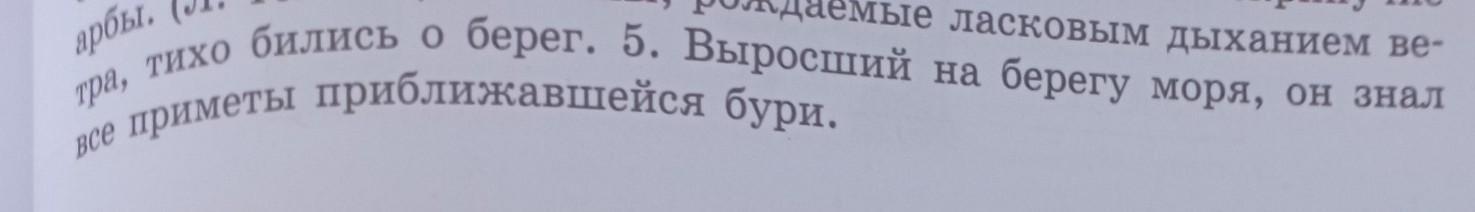 выросший на берегу моря ( причастный оборот), он( подлежащее выраж. местоимением) знал ( сказуемое) все ( местоимение) приметы ( дополнение) приближавшейся ( прич.) бури ( дополнение)