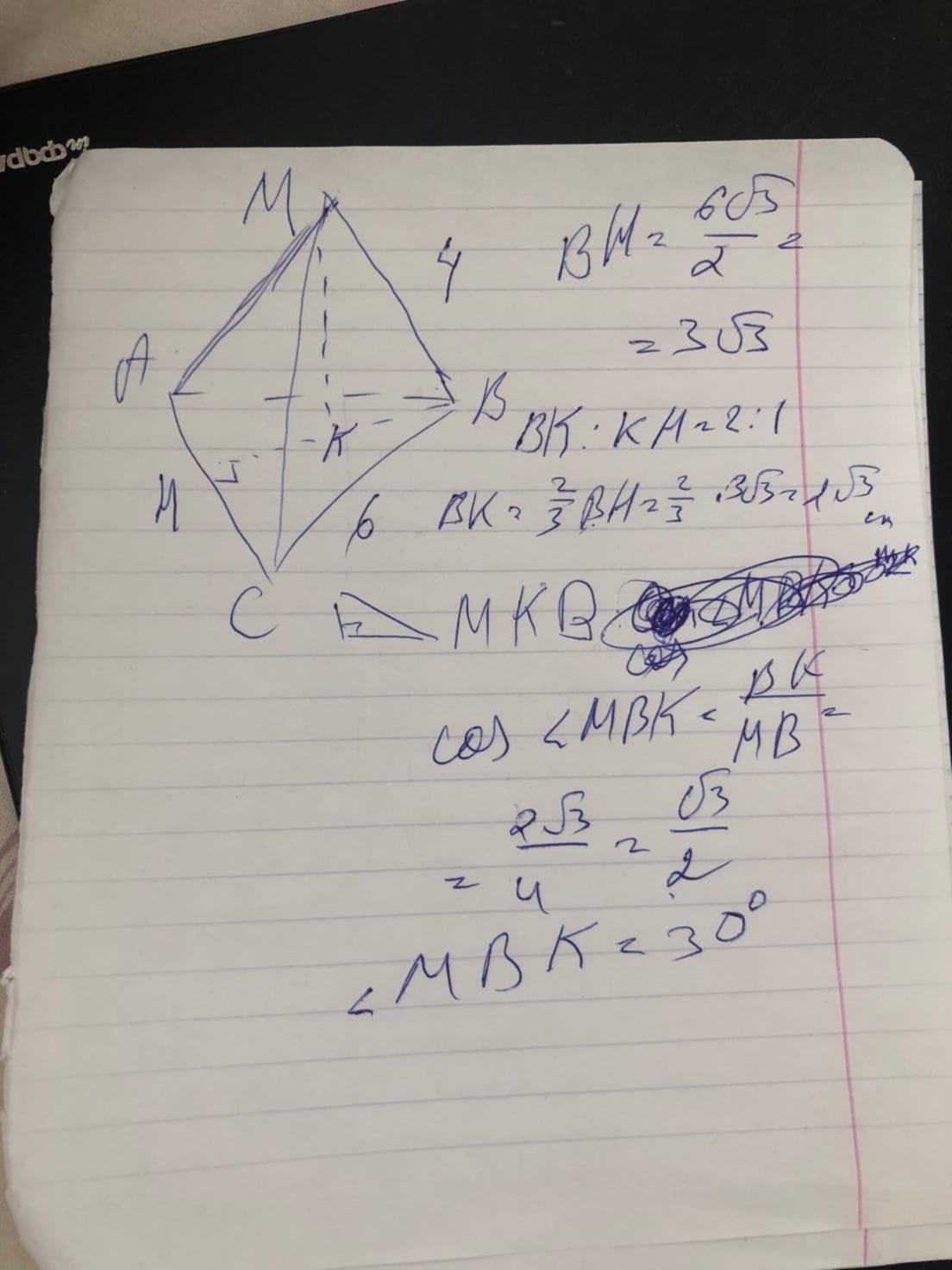Пусть ТАВС - правильная треугольная пирамида, у которой ТО- высота, АВ+АС+ВС=6см, ТВ=4 см. Надйо найти угол наклона бокового ребра пирамиды к плоскости основания.