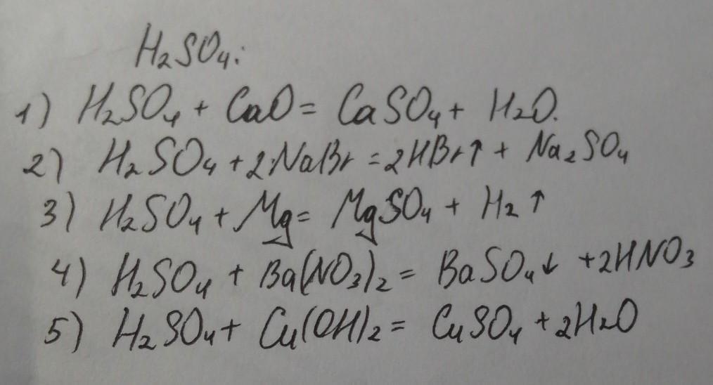 Даны следующие вещества: CaO, NaBr, Mg, Ba(NO3)2, SO2, HCl, Cu(OH)2, Cu. С какими из них будет реагировать серная кислота. Напишите уравнения реакций.