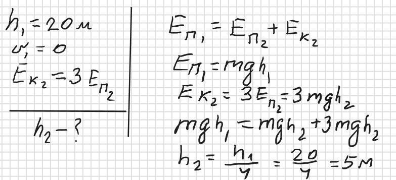 камінь відпускають без початкової швидкості з висоти 20 м на якій висоті його кінетична енергія стане в 3 рази більшою за потенціальну опором повітря знехтуйте