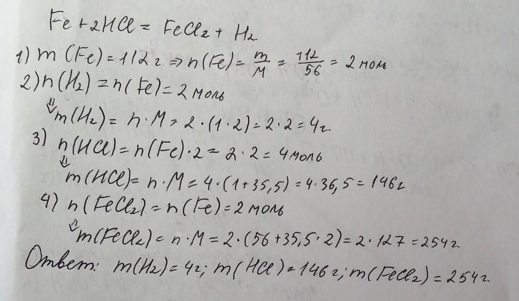 3) Найди массу соляной кислоты (HCl) и хлорида железа 2 (FeCl2) в предыдущей задаче