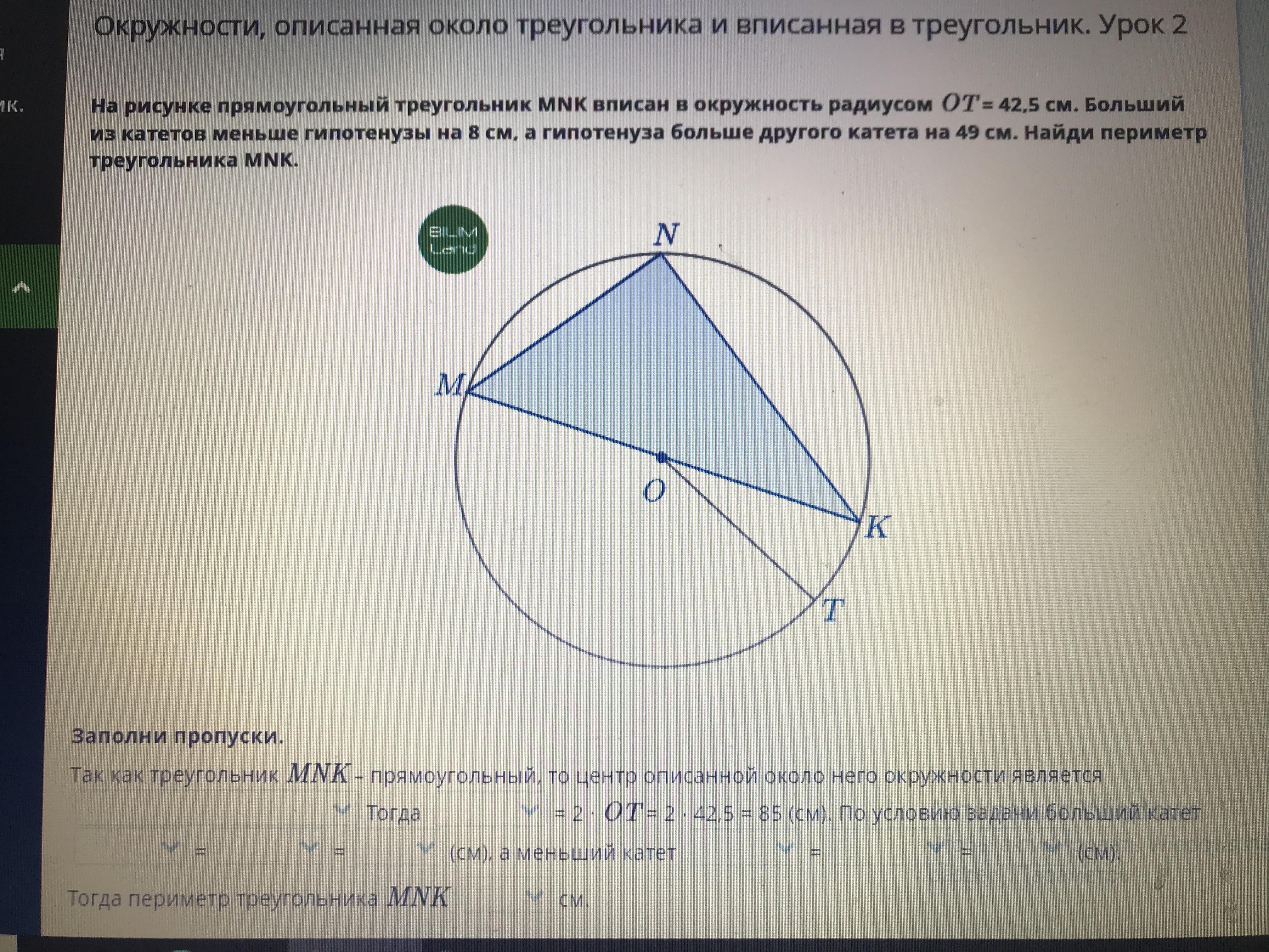 МК=МО+ОК=42,5*2=85(гипотенуза)