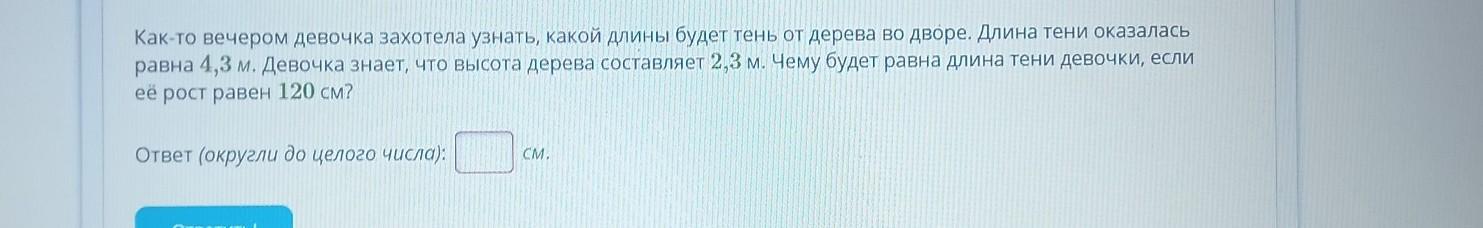 Как-то вечером девочка захотела узнать, какой длины будет тень от дерева во дворе. Длина тени оказалась равна 4,3 м. Девочка знает, что высота дерева составляет 2,3 м. Чему будет равна длина тени девочки, если её рост равен 120 см? Ответ (округли до целого числа): CM. Отретить