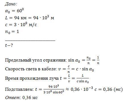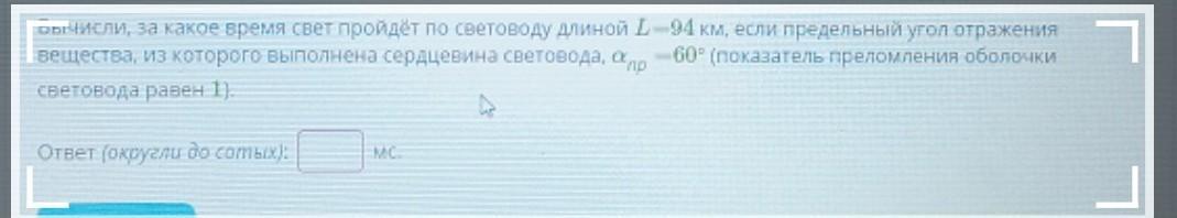 Вычисли, за какое время свет пройдёт по световоду длиной L=94 км, если предельный угол отражения вещества, из которого выполнена сердцевина световода, а =60° (показатель преломления оболочки np световода равен 1) MC. Ответ (округли до сотых):