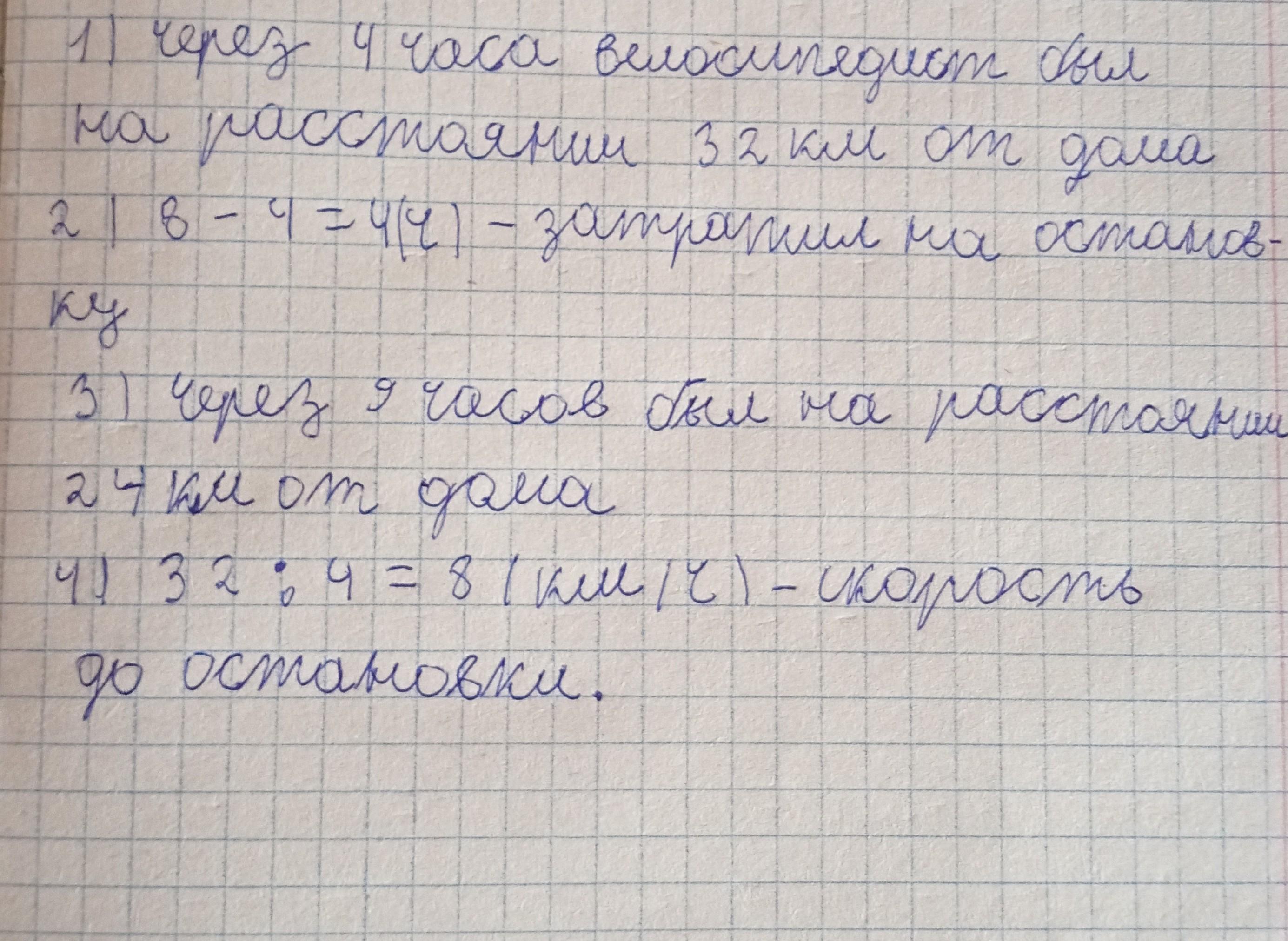 1) На каком расстоянии от дома был велосипедист через 4 ч после начала движения? 2) Сколько времени велосипедист затратил на остановку? 3) Через сколько часов после начала движения велосипедист был на расстоянии 24 км от дома? 4) С какой скоростью ехал велосипедист до остановки? даю 50 баллов