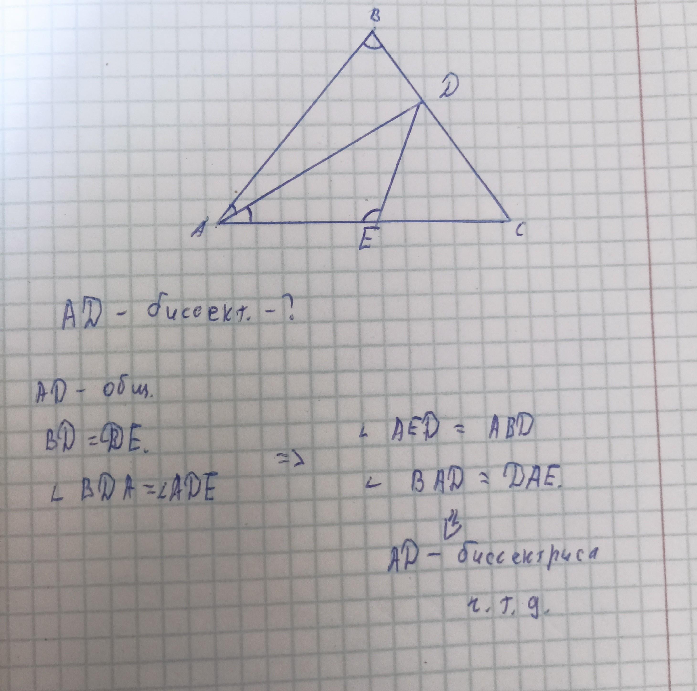 в треугольнике ABC на сторонах BC и AC отметили точки D и E соответственно BD=DE,угол BDA=углу EDA.Докажите,что AD-биссектриса треугольника ABC.