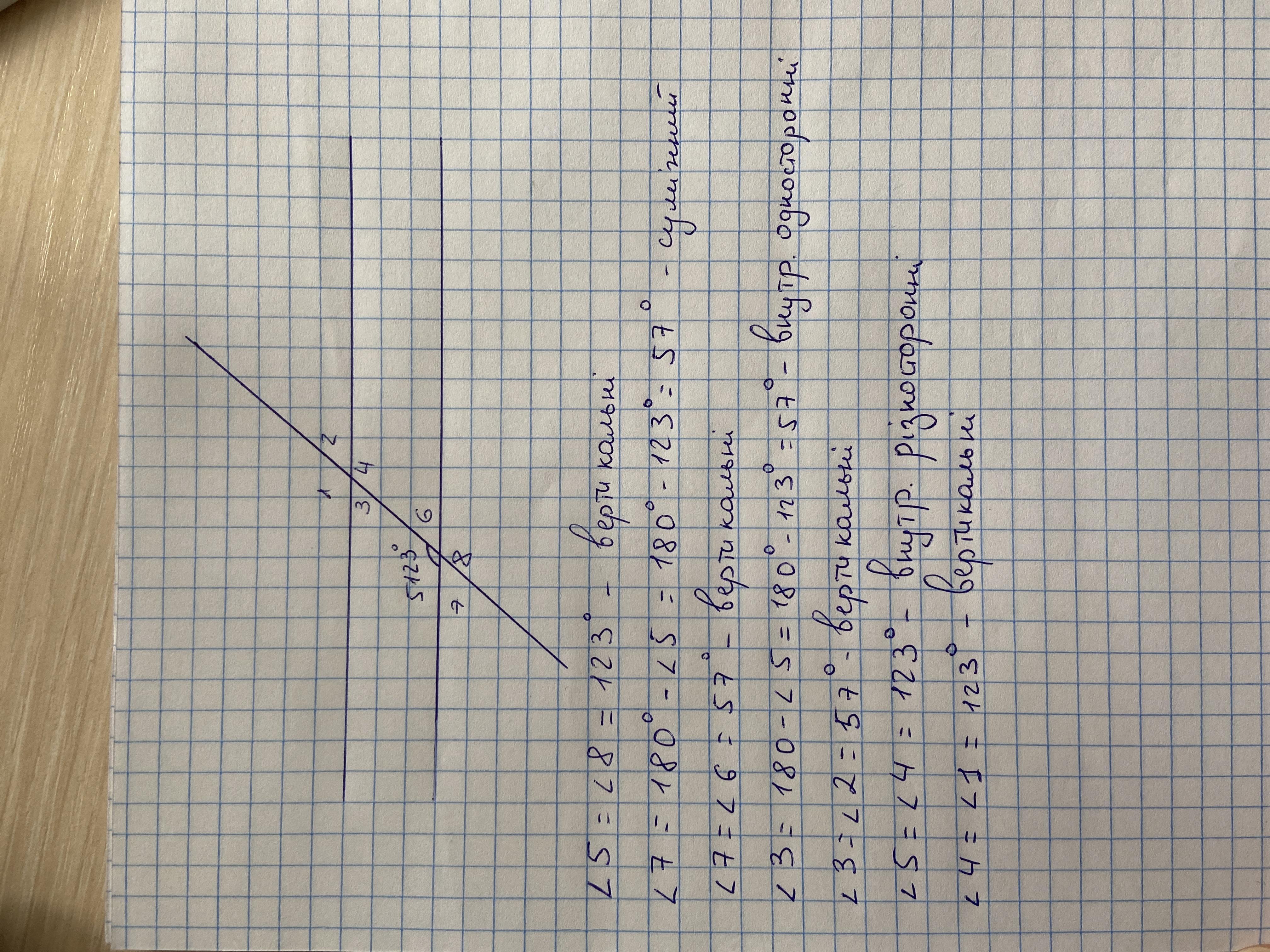 Срочно!!!!!! Один с кутів що зявивсь при перетині паралельних прямих січною дорівнює 123 градусів знайдіть решту кутів зробіть малюнок