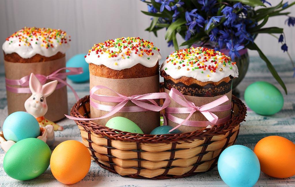 На переднем плане фотографии мы видим два куличика и несколько разноцветных яичек.