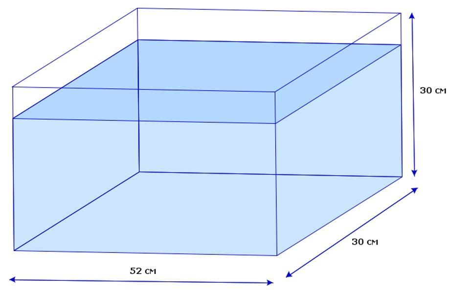 В аквариум, формой и с размерами как указано на рисунке, налили воды, оставив 5 сантиметров до верхнего края. Марат хочет поместить туда рыбок. На 1 рыбку должно приходиться 0,0025 м3 воды. Сколько рыбок может поместить в аквариум, исходя из данных условий?