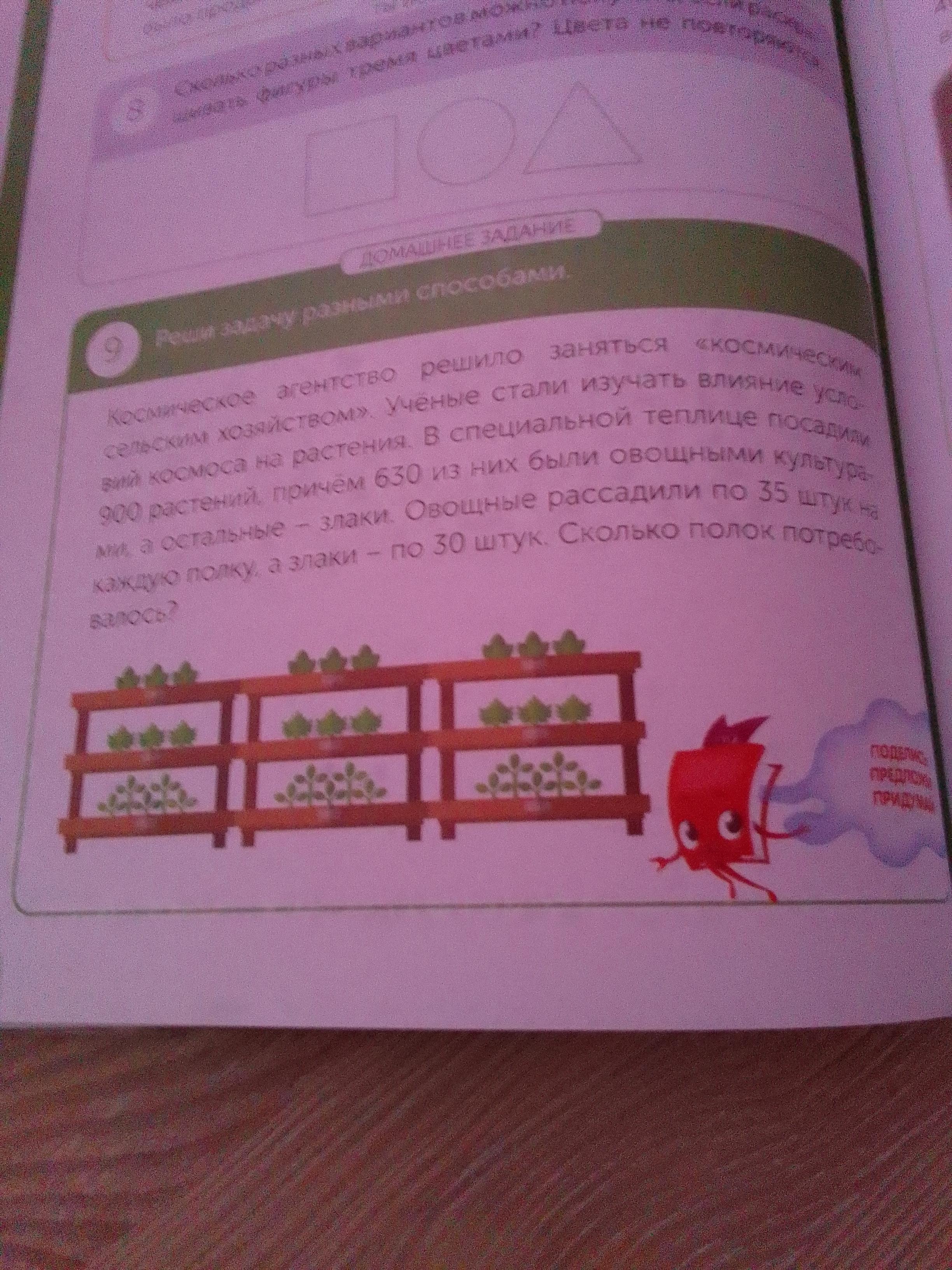 630 : 35 + (900-630) : 30 = 18 + 9 = 27 полок потребовалось
