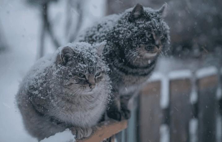 2 кота сидят холодной зимой на промёрзлом заборе.