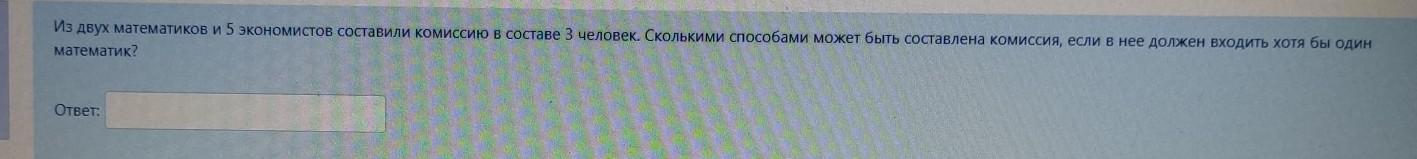 В комиссию может входить 1 математик и 2 экономиста или 2 математика и 1 экономист. Порядок выбора каждого специалиста не важен, поэтому используем формулу сочетаний (логическое "или" заменяем знаком "+").
