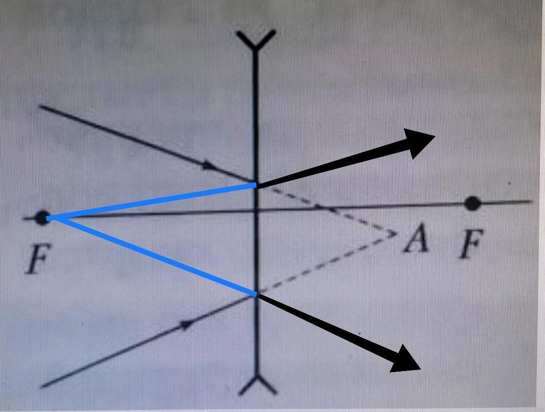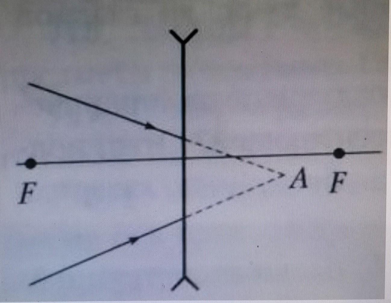 Продолжения световых лучей, падающих на тонкую стеклянную линзу, пересекаются в точке А. Определите построением положение точки пересечения лучей после их преломления в линзе с известным положением фокусов.