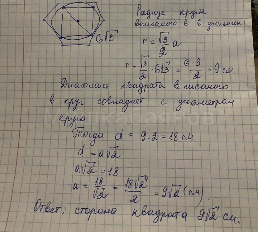 ДАЮ 50 БАЛЛОВ! окружность вписана квадрат. Около заданной окружности описан правильный шестиугольник со стороной 6√3 см. Найдите сторону квадрата.