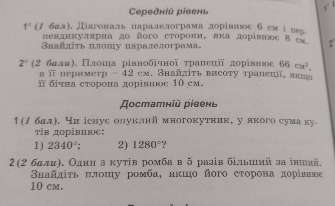 2. т.к. трапеция равнобедренная, то боковые стороны равны, в сумме 10+10=20(см), значит, на долю суммы оснований приходится 42-20=22(см), полусумма оснований равна 22:2=11 (см), площадь равна произведению полусуммы оснований 11 cм на высоту h, т.е.