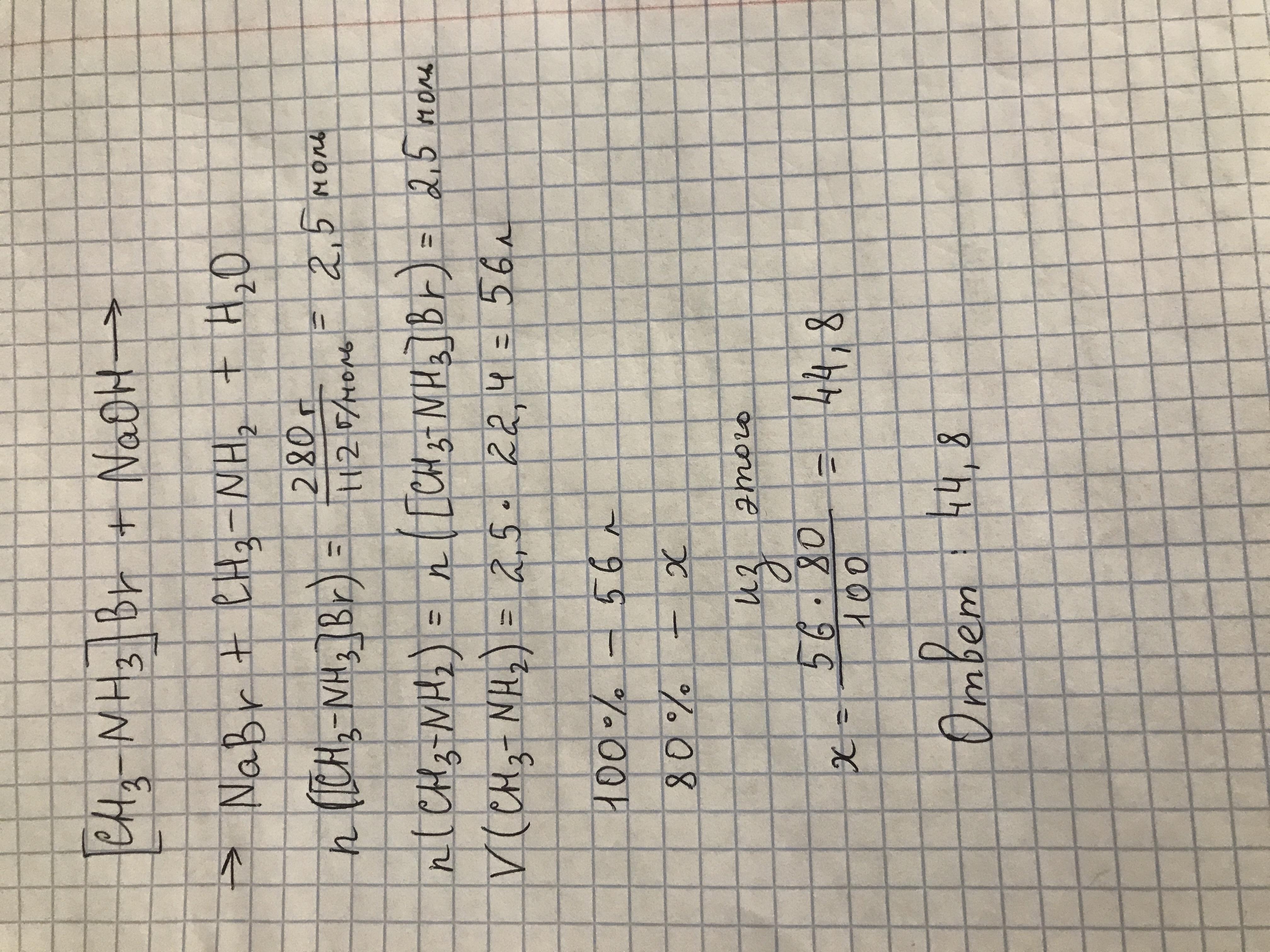 В результате взаимодействия бромида метиламмония массой 280 г с избытком гидроксида натрия был получен метиламин с выходом 80 %. Определите объём (в л.) (н.у.) выделившегося амина. (Запишите число с точностью до десятых.)